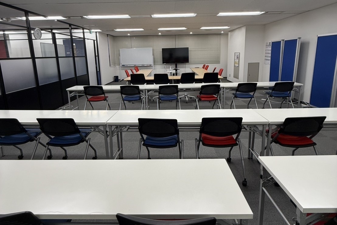 最大40~50人で会議や研修ができる会議室となります。 パーティションで区切ることにより、小会議室を複数作ることもできます。 65インチモニタが設置されており、TV会議も行えます。
